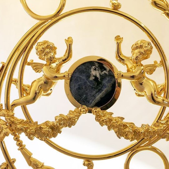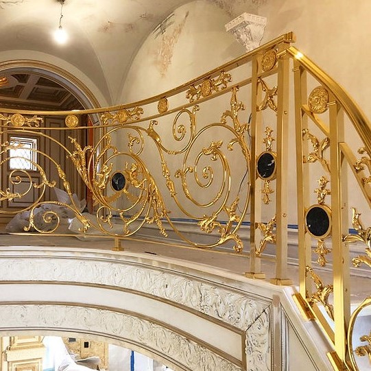Латунное ограждение с блестящим позолоченным покрытием. В дизайне используются изогнутые под нагревом сплошные квадратные прутки, украшенные завитками, листьями, цветами и изысканным литьём из латуни. Акценты из лазурита придают уникальность. Поручень выполнен из массива латуни.