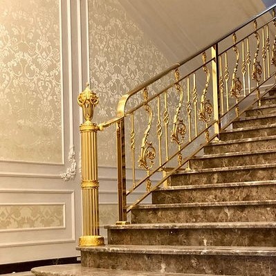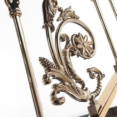 Brass balustrade with a gleaming gold-plated finish, accented by matte black nickel details. The graceful interplay of leaves and curls, combined with sculpted columns, gives this piece its distinctive character and timeless elegance.