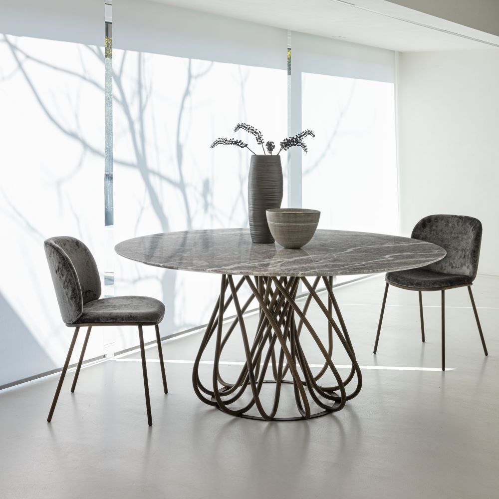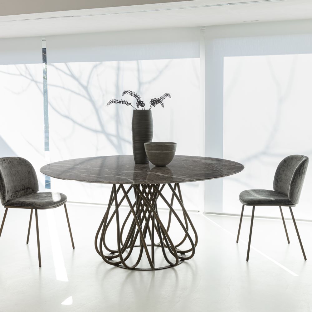 Elegant and sophisticated, the Infinito design table boasts a strong personality and identity, featuring a metal base characterized by the intertwining of 17 lines. This modern interpretation with an Art Nouveau flair, combined with a round top and premium finishes, makes it a perfect addition to the living spaces of any home.