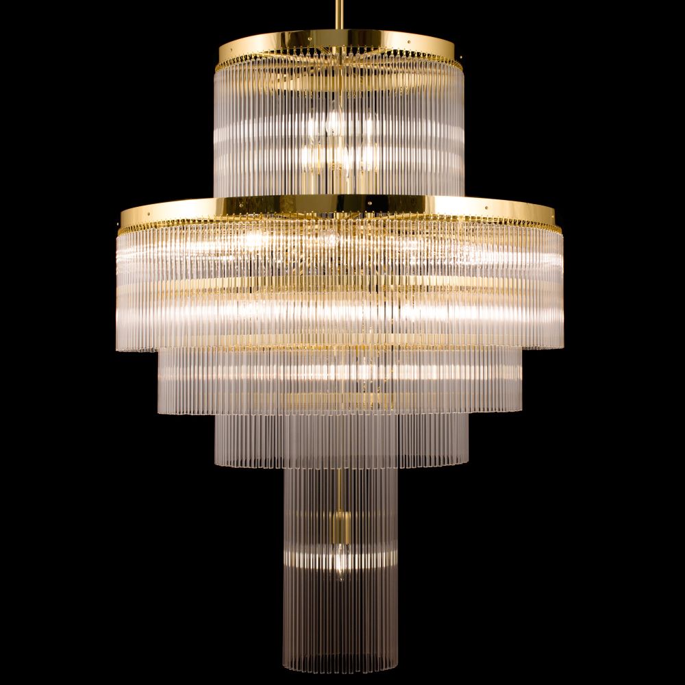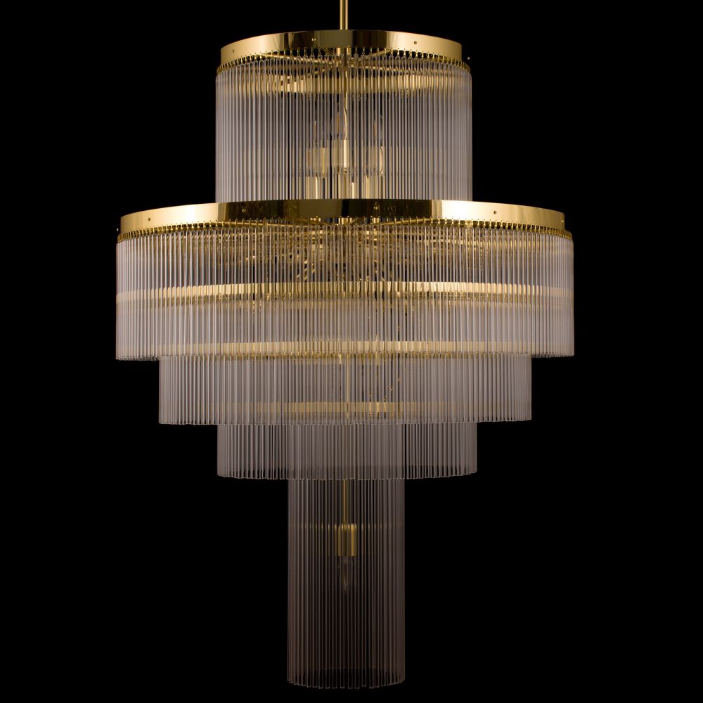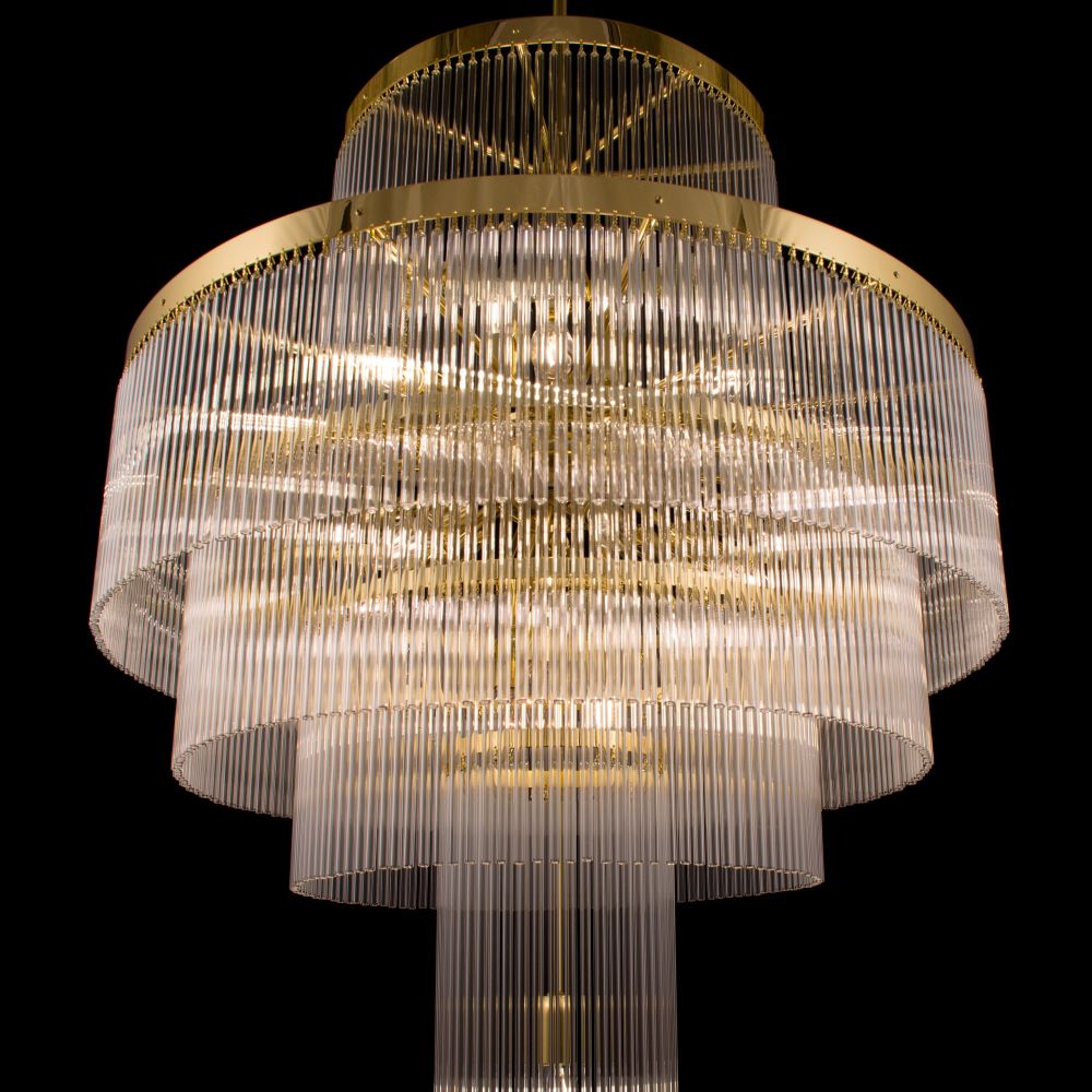 This stunning, large-scale ceiling lamp features a unique and original design composed of multiple brass rings. Each ring is adorned with finely hand-cut glass tubes that create a mesmerizing light effect by beautifully diffusing the illumination from the bulbs. A true statement piece, this lamp is perfect for modern interiors seeking a blend of elegance and creativity.
